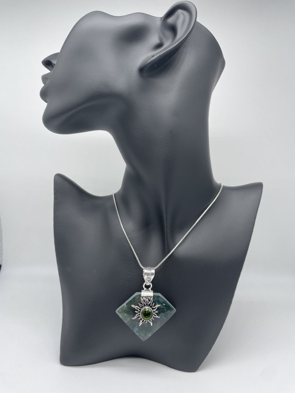 This moss agate stone is beautifully complemented by the peridot sun on top to make for a very interesting necklace. Main Moss Agate gemstone is approximately 5cm across widest point.